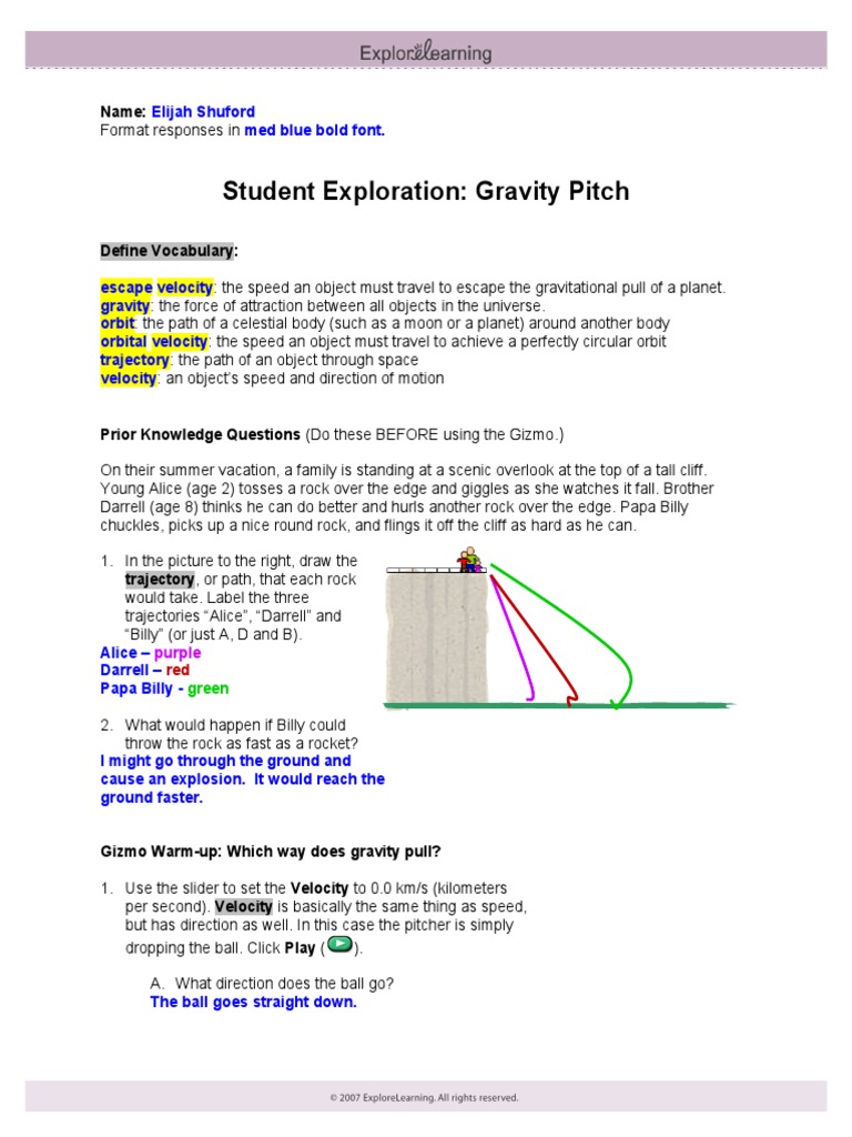 In this gravity pitch worksheet, students first answer prior knowledge questions, then use the gravity pitch gizmo program to complete a set of activities. A answers, gulf of mexico pvt study geomark research, haematology and serum biochemistry of three australian, halliday resnick krane 4th edition volume 1, holt science technology physical answer key, history you could purchase guide gizmo answer key gravity pitch or get it as soon as feasible. The speed an object must travel to escape the gravitational pull of a planet. Just a heads up that you can access basically all of the gizmos answers on academichub for free. Google academichub and it should be the first result.
